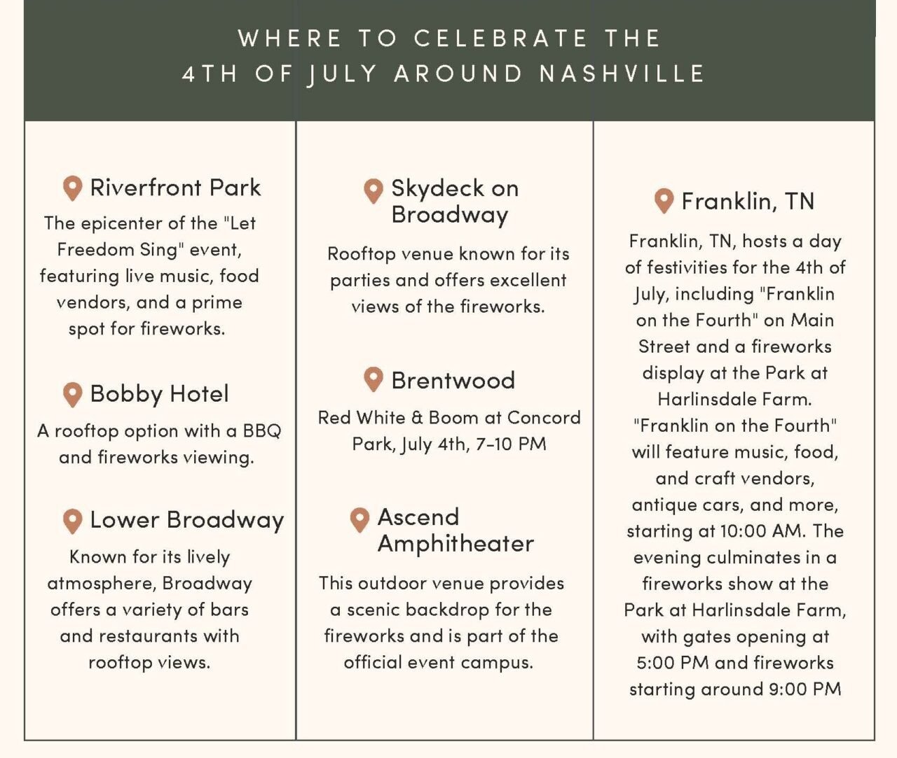 It’s almost time to let freedom ring here in Nashville! There are so many fun places to take in the fireworks and celebrate with both friends and family. Attached is our 4th of July guide for events in Nashville, to Franklin, Brentwood, and beyond. Hope you have a wonderful 4th!